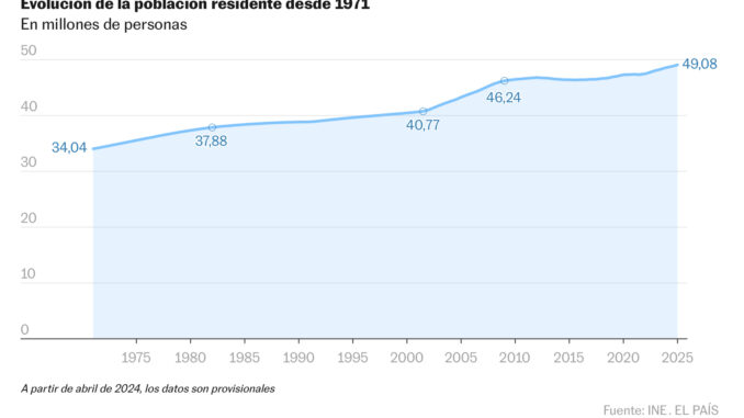 Fuente: EL PAÍS. https://elpais.com/sociedad/2025-02-13/la-poblacion-espanola-supera-los-49-millones-de-habitantes-gracias-al-aumento-de-extranjeros.html