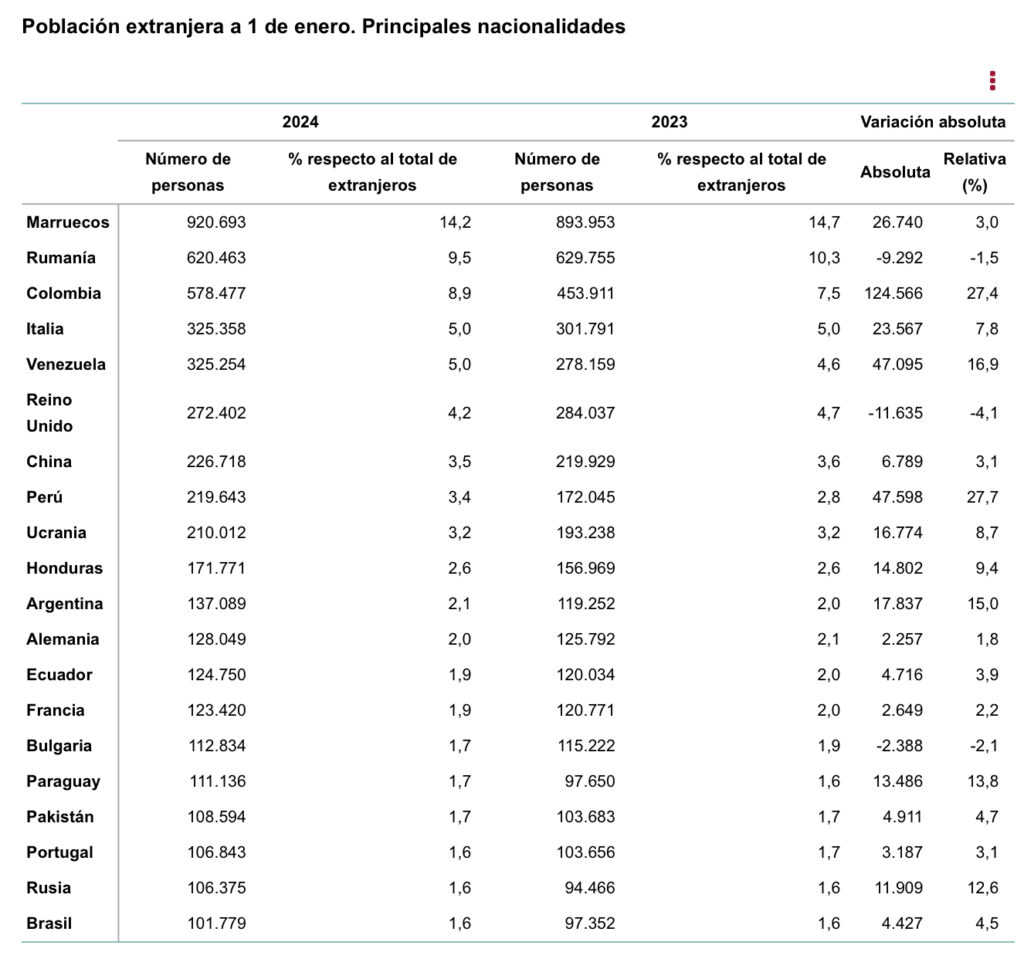 Entre los inmigrantes llegados a España en 2024, los colombianos lideraron las cifras con 43.400 personas, seguidos por los venezolanos (30.500) y los marroquíes (27.700). Sin embargo, Marruecos también destacó como el país con mayor número de emigrantes residentes que abandonaron España (12.300), seguido por Colombia (11.900) y Rumanía (9.900).
