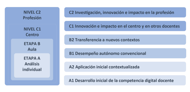 - Diseño de un nuevo modelo de progresión, basado en las distintas fases de desarrollo profesional, que son utilizadas como criterio para establecer los distintos niveles, si bien, se mantiene la nomenclatura establecida en el MCER, adoptada por el DigCompEdu, para facilitar las correspondencias con el marco europeo.